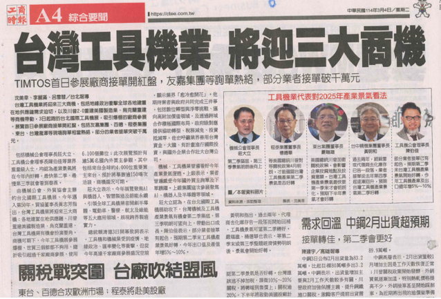 TIMTOSについては、3月4日の新聞に大きく取り上げられていた。台湾の金融・商業に特化した工商時報では、「台湾工作機械業界は3つの大きなビジネスチャンスを迎えることになる」との見出しで、①現地サプライチェーンへの地政学的な影響と現地建設の緊急需要、②トランプ2.0による米国製造業の再建、③ウクライナの再建により、台湾工作機械産業のビジネスチャンスに大きな期待を寄せているという。
