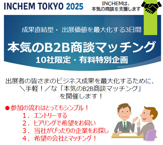 ㈱事業革新パートナーズは、2025年9月17日~19日、(公社)化学工学会および(一社)日本能率協会が主催する、化学産業を中心としたプロセス産業およびプラント設備、エンジニアリングの総合展示会「INCHEM TOKYO 2025」における併催企画、「本気のB2B商談マッチング」を企画・運営いたしました。